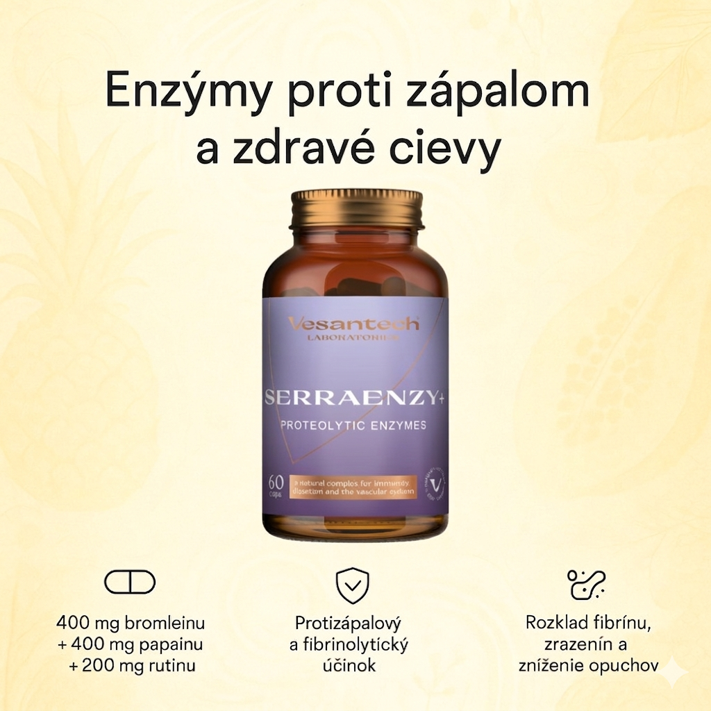 Naše vedecké centrum vyskladalo pre Vás SerraEnzy + ako náhradu za Serrapeptázu, ktorá nie je v EU povolená. Vybrali sme komplex enzýmov, ktoré spolu dávajú silný protizápalový, fibrinolytický a analgetický účinok, podobne ako serrapeptáza.