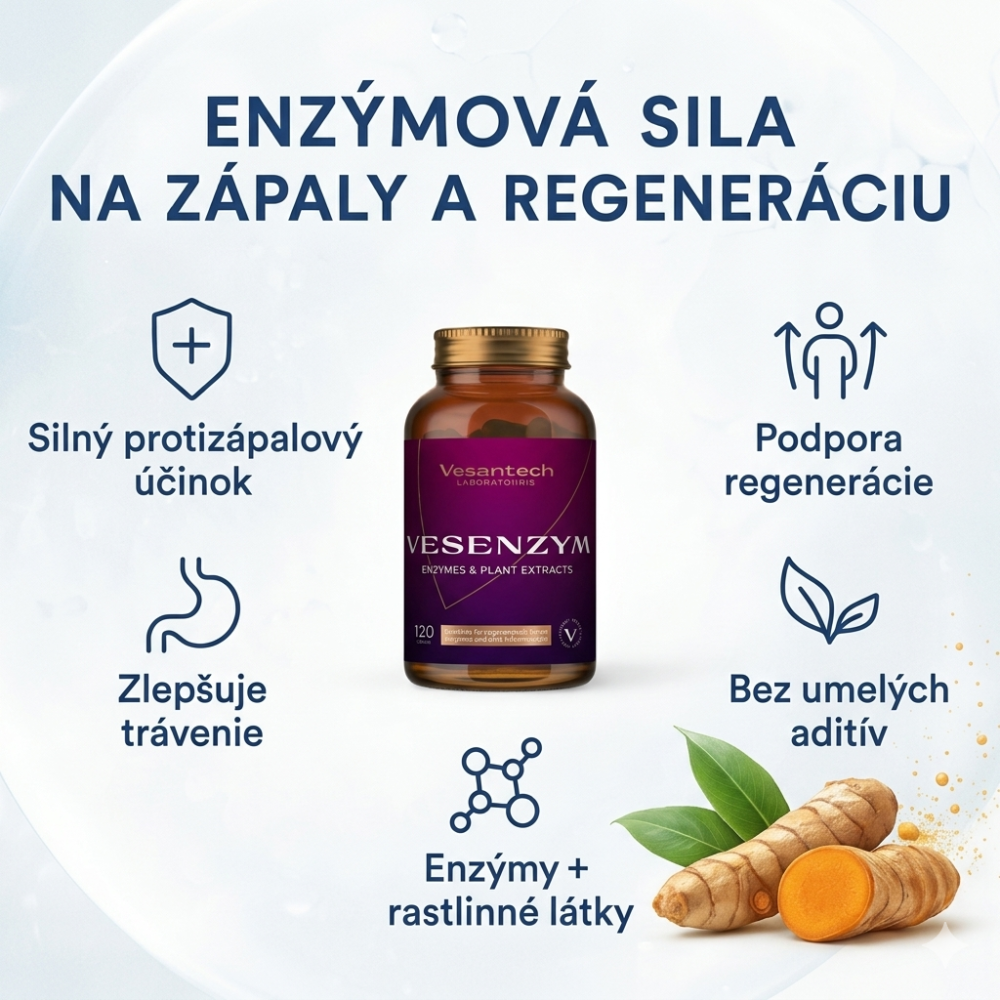 Vesenzym je vysoko účinný enzýmový komplex, ktorý obsahuje silnejšie a modernejšie enzýmy, ako ktorýkoľvek enzýmový prípravok na trhu. Má výrazné synergické zložky (boswellia, kurkumín, quercetín, nattokináza Je to prírodný enzýmový komplex na zápaly, opuchy, regeneráciu, pri trombózach, ale aj a lepšie trávenie.