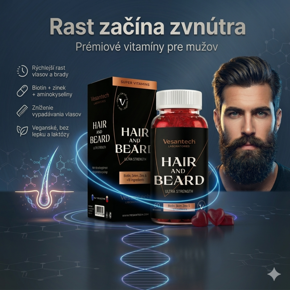 Vesantech Hair and Beard Gummies sú prémiové gummies vitamíny pre mužov, ktorí chcú podporiť rast vlasov, hustotu brady a celkovú vitalitu vlasových folikulov. Ich unikátne zloženie kombinuje biotín, zinok, selén, vitamíny skupiny B, aminokyseliny a minerály, ktoré pôsobia priamo zvnútra a riešia príčiny vypadávania vlasov či spomaleného rastu brady.