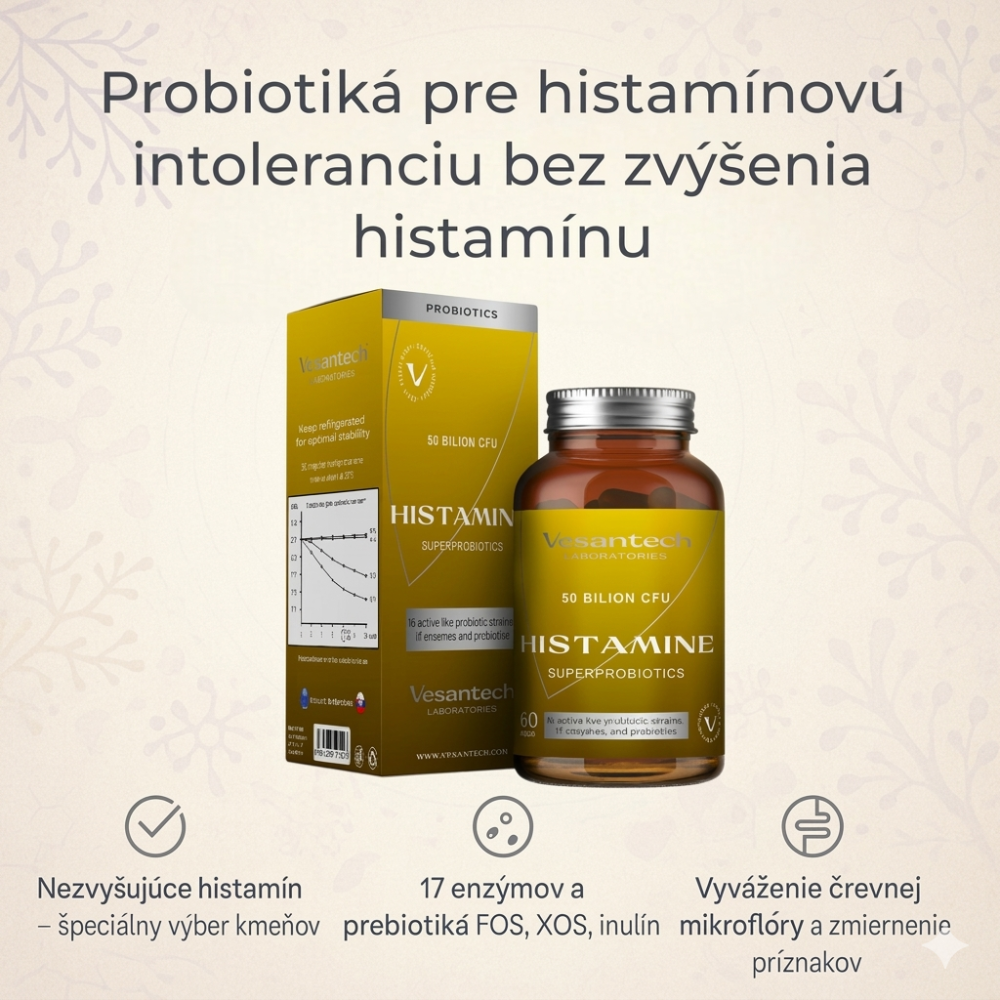 Špeciálne super probiotiká Vesantech Histamine – váš spoľahlivý spoločník pri histamínovej intolerancii. Postupne sa zlepší vaša intolerancia a budete tolerovať viac potravín.