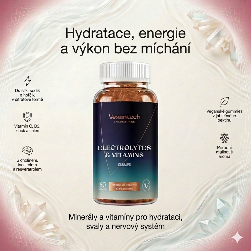 Elektrolyty s vitamíny ve formě gummies – moderní doplněk elektrolytů a esenciálních vitamínů bez míchání prášků, praktická a chutná alternativa k běžným práškovým nápojům. Místo rozpouštění ve vodě můžete jednoduše doplnit elektrolyty ve formě veganských gummies vyrobených z jablečného pektinu – kdekoli a kdykoli.