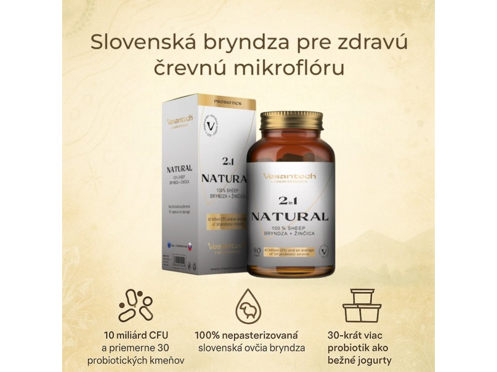 Přírodní živé probiotika z lyofilizované 100% slovenské ovčí bryndzy a 100% ovčí syrovátky v denní dávce 10 miliard CFU a 30 probiotických kmenů.