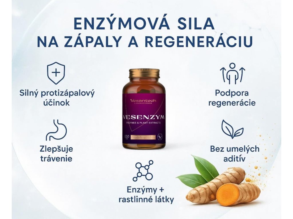 Vesenzym je vysoce účinný enzymový komplex, který obsahuje silnější a modernější enzymy než jakýkoli jiný enzymový přípravek na trhu. Obsahuje významné synergické složky (boswellia, kurkumin, kvercetin, nattokináza). Jedná se o přírodní enzymový komplex pro záněty, otoky, regeneraci, trombózu a lepší trávení.